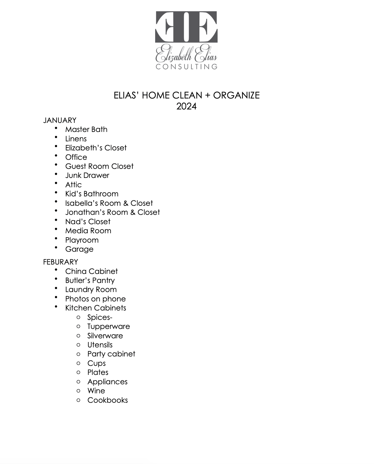 Here is a peek at my family's organizing list. Of course this will look a little different for everyone, but I hope it can act as a springboard for your home: